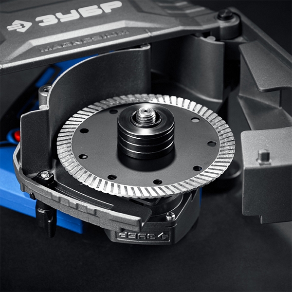 - Закрывающий зону работы подпружиненный кожух предотвращает разброс продуктов реза при любом погружении дисков